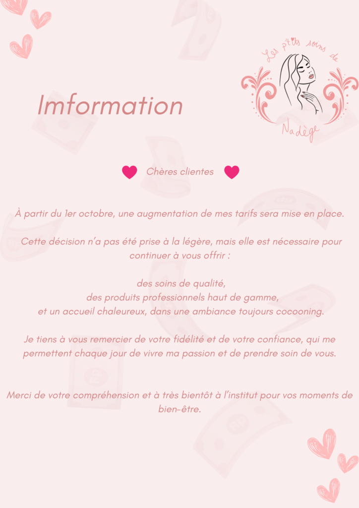 Je vous propose de découvrir ces soins spécialement pour vous (épilations, soin visage), sans oublié la manucure simple, les massages…